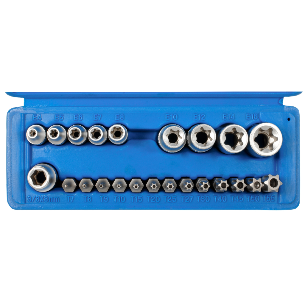 Chrom-Vanadium, in Kunststoffkassette, 10 mm (3/8") Aufnahmeadapter, 6,3 mm + 10 mm (1/4" + 3/8") Einsätze