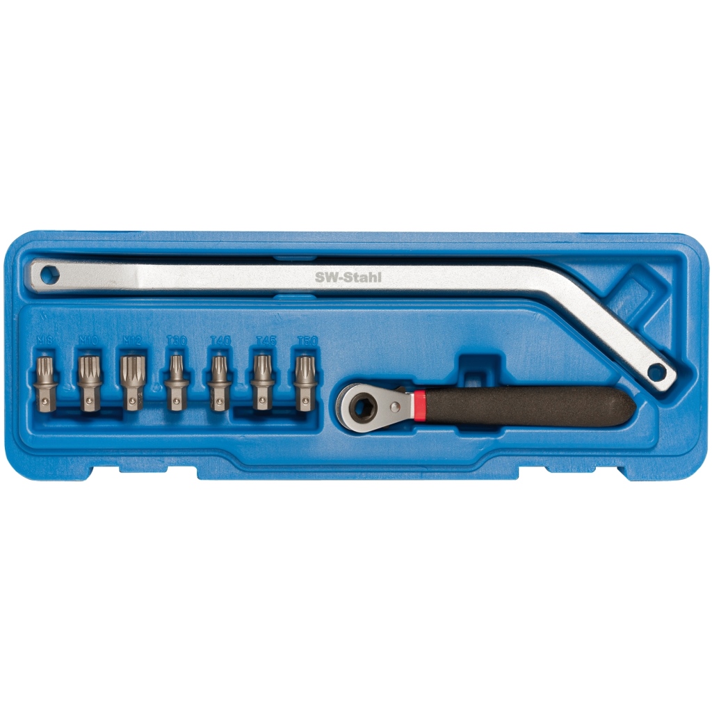 zum Einstellen der Türscharniere.Abgewinkelte Ratsche und 2-fach abgewinkelter Montagehebel mit 8 mm Sechskant Bit-Aufnahme.
